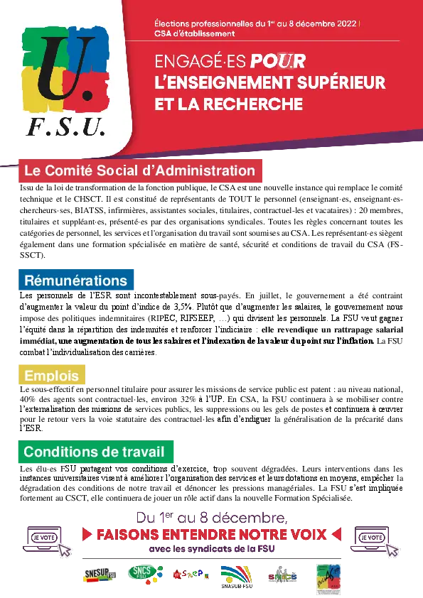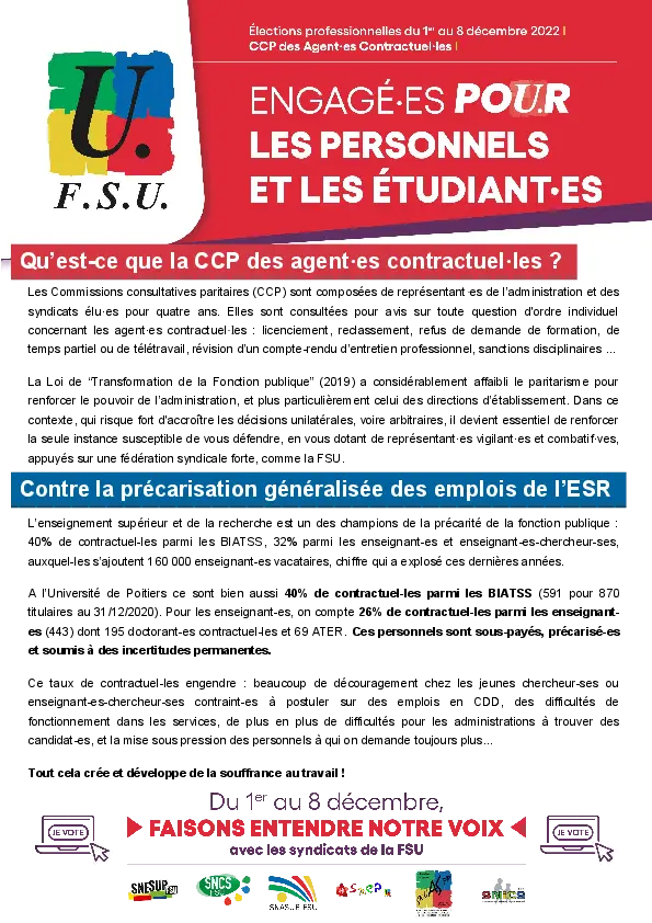 La FSU université de Poitiers (SNESUP, SNASUP, SNEP, SNUAS, SNICS, SNCS et SNES) a déposé des listes aux élections professionnelles qui se dérouleront du 1 er au 8 décembre 2022.