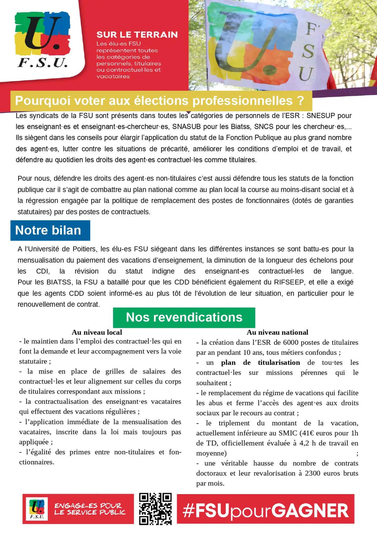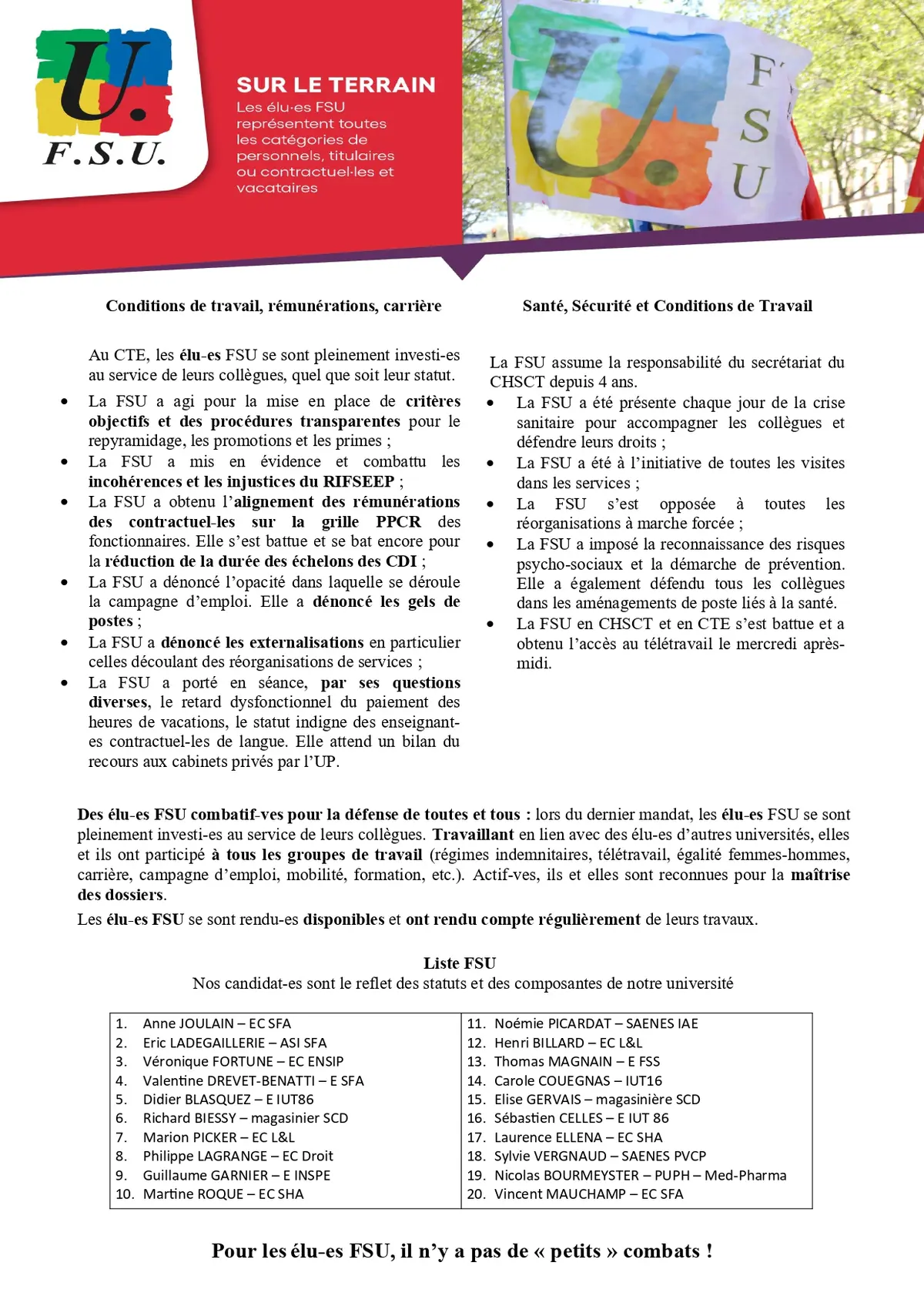 Ces élections concernent tant les agents titulaires que les contractuels. La FSU Université de Poitiers dépose des listes pour l’ensemble des scrutins.