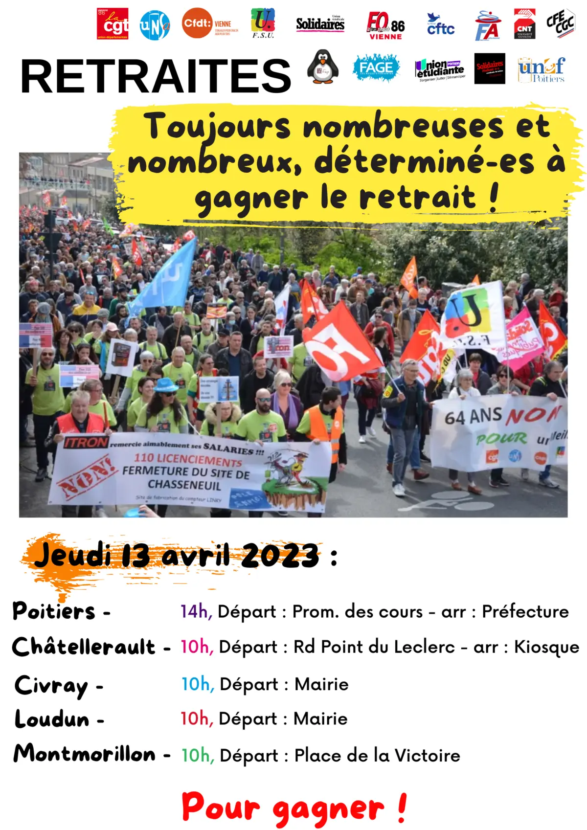 L’intersyndicale appelle à une journée de mobilisations et de grève le 13 avril et soutient toutes les actions et initiatives intersyndicales de mobilisations, y compris le 14 avril, pour gagner le retrait de cette réforme.