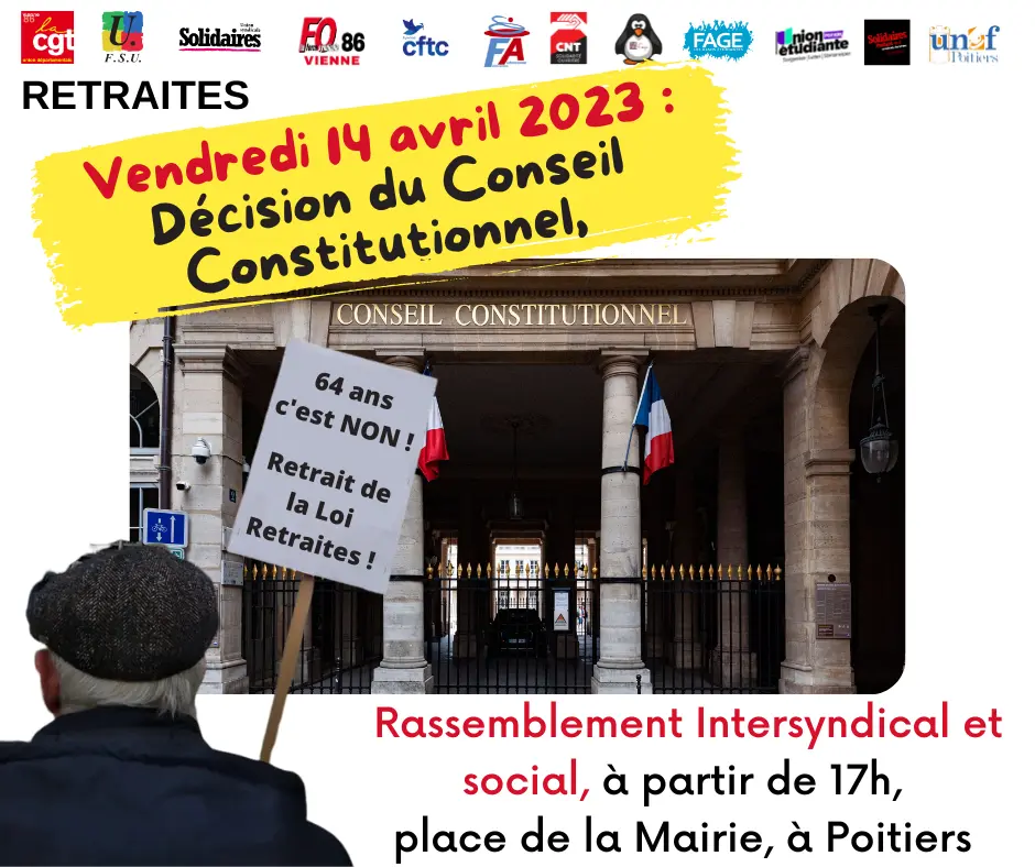 Poitiers : : décision du Conseil Constitutionnel : Rassemblement Intersyndical et Social à partir de 17h place d’Armes (ou Général Leclerc ou place de la Mairie)