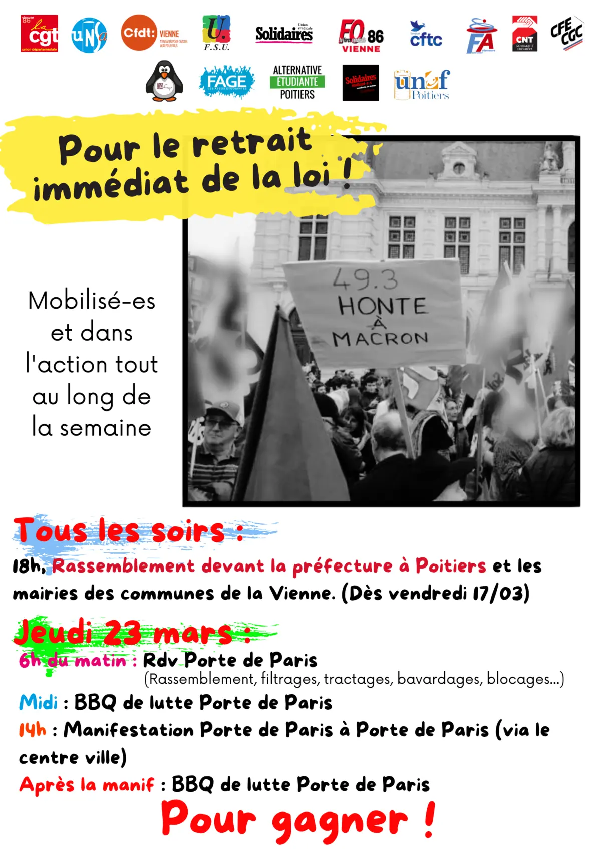 Tous les soirs : 18h Rassemblement devant la Préfecture à Poitiers et les mairies des communes de la Vienne (dès vendredi 17/03)